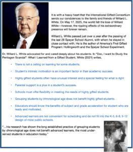 His major professor and mentor is Dr. Joseph Renzulli. Part of his doctoral program included an internship at the Connecticut Department of Education working with the State Director of Gifted education. Returning to his former position with the Birmingham, MI Schools, he also served as an Instructor at Michigan State University and as Executive Secretary for the Michigan Alliance for Gifted Education. In 1993, Willard White accepted the position of Coordinator of Gifted Programs in the School District of Palm Beach County, Florida, the eleventh largest school district in the U.S. He held that position for sixteen years and retired in 2009.