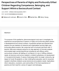 Rebecca (Becki) M. Johnson, Ph.D. is a postdoctoral research associate at Purdue University. She earned a Ph.D. in Educational Psychology, Gifted and Talented Education from the University of North Texas. Her experience as an educator and parent has led to research interests including social-emotional well-being of gifted individuals, parenting in the context of high/profound giftedness, creativity, and access to academic opportunities for gifted students from diverse backgrounds. She was assistant editor of Journal of Advanced Academics, 2020-2022; co-chair of NAGC’s Research and Evaluation Network Graduate Student Committee, 2021-2023; assistant program chair for NAGC’s Research and Evaluation Network, 2023-2025; and currently serves as program chair for NAGC’s Research and Evaluation Network. Her work has been published in Gifted Child Quarterly, Journal for the Education of the Gifted, SENG, Journal of Creativity, High Ability Studies, Teaching for High Potential, and Parenting for High Potential.