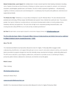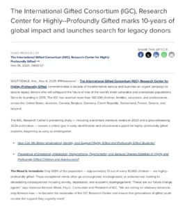 The International Gifted Consortium (IGC), Research Center for Highly-Profoundly Gifted educates parents, teachers, administrators, counselors, psychologists, and pediatricians on research-based behaviors, development, and developmental potential.
